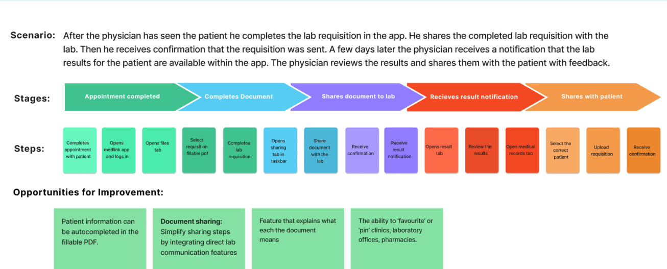 We mapped the doctor's journey with MedLink: After an appointment, they complete a lab requisition, share it, and get notified of results. MedLink streamlines this process, reducing admin time with auto-filled forms and improving communication through real-time updates.