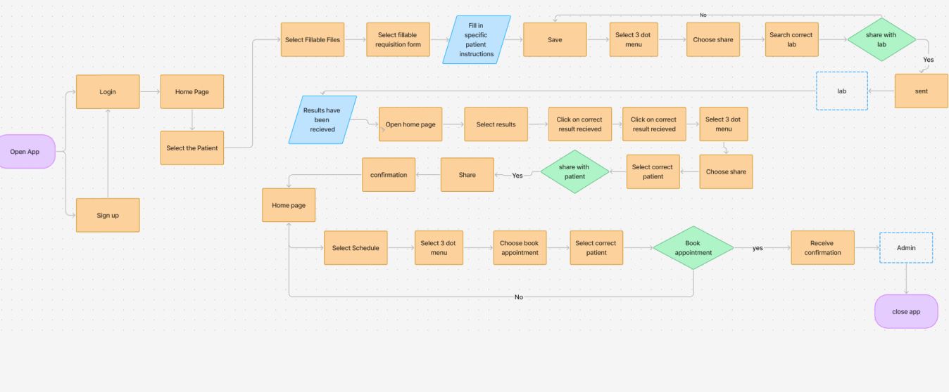 Based on the journey map, we developed a user flow outlining each step a doctor takes - from opening the app to sharing lab results. This served as a blueprint for our design and helped us build an intuitive, efficient interface.
